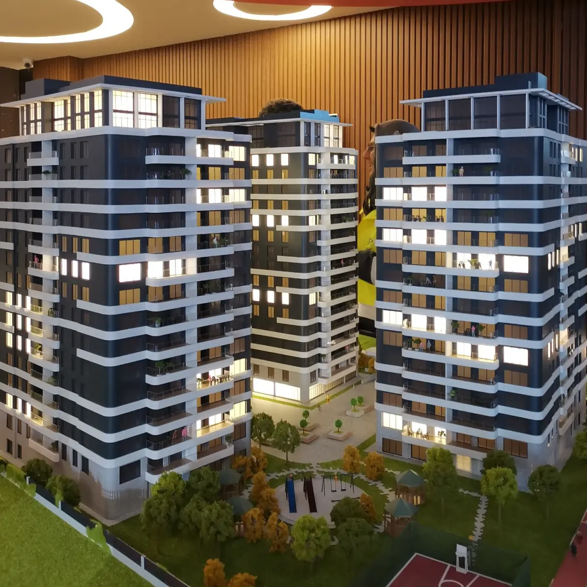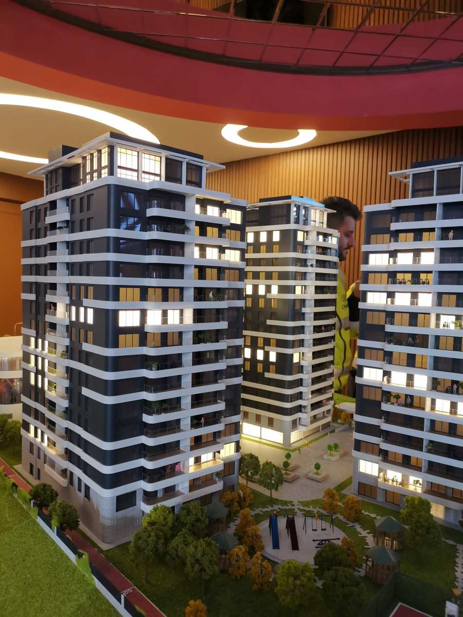 Projenin Adı: Asgardia Aydınlıkevler Firma: CMK GROUP Ölçek: 1/75 Ankara Aydınlıkevlerde CMK Group tarafından geliştirilen, Asgardia Aydınlıkevler projesinin maket çalışması firmamız tarafından gerçekleştirildi. Proje 3+1 ve 4+1, dairelerden oluşan proje, içerisinde bulunan AVM ile dikkat çekmektedir. Bu konut maketi, bilgisayar kontrollü (otomasyonlu) aydınlatma ile üretilmiştir. Her daire aydınlatmasını ayrı ayrı kullanabilme, satılan daireleri işaretleme gibi özellikler sayesinde çok sayıda dairenin satış yapıldığı bu tarzda büyük projelerde kolaylık sağlamaktadır. Proje üzerinde bulunan peyzaj alanları, projenin çevre ile uyumunu, estetik görünümünü yansıtmak için özel üretim çim ve ağaç detayları ile yeterli sayıda çeşitli renkler kullanılarak özenle işlenmiştir. Ticari kısımlara; görselliği yükseltmek, gerçekçiliği artırmak için, arka kısımda UV baskı ile mağaza giydirmeleri, ön kısımda şeffaf cam detayı ile derinlik verilerek üretilecekti