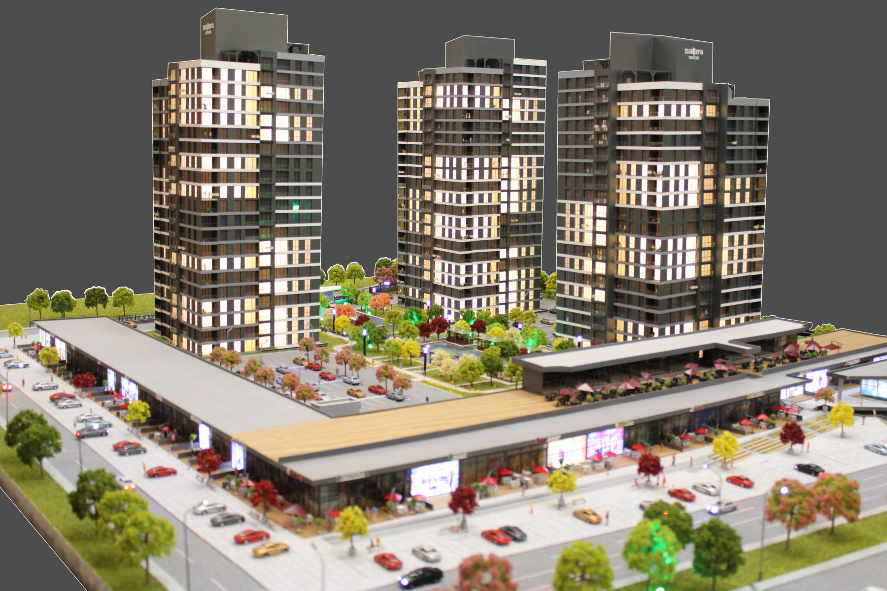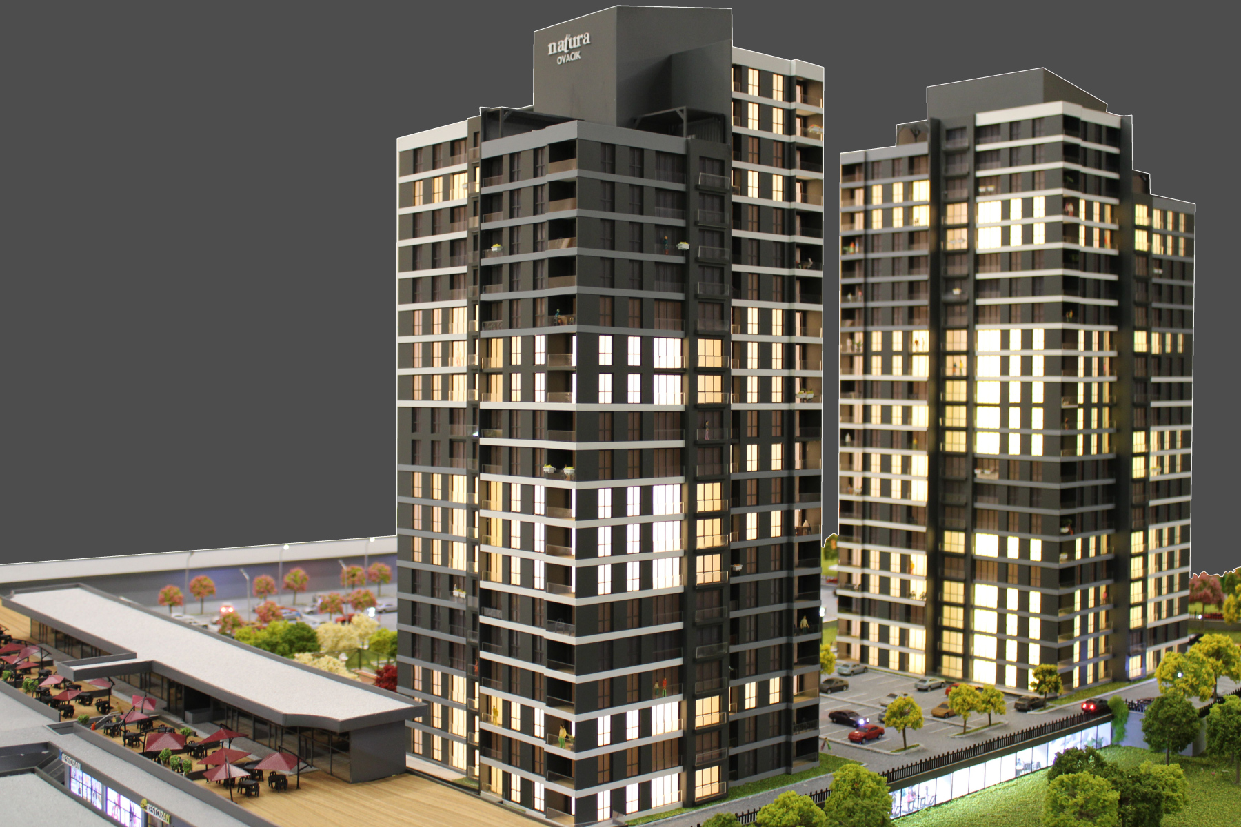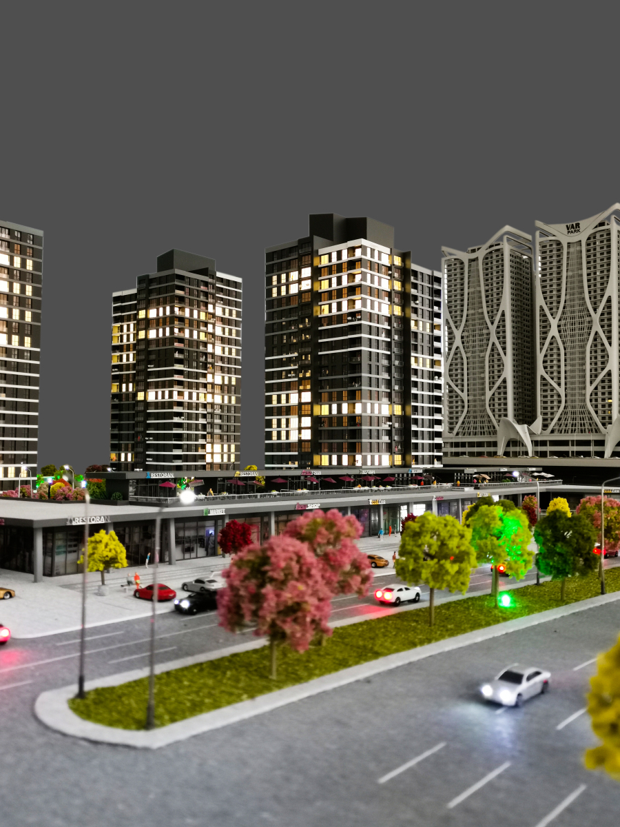 Projenin Adı: Natura Ovacık Maketi Firma: Fırat İnşaat Ölçek: 1/100 Ankara Ovacıkta Fırat inşaat tarafından inşa edilen ,konut ve cadde avm konseptinde tasarlanan Natura Ovacık projesinin maket çalışması firmamız tarafından gerçekleştirildi. 3 Adet Blok 4+1 Daire Tipi 239 Konut 65 Adet Cadde Mağaza dan oluşan projenin maketi bilgisayar kontrollü (otomasyonlu) aydınlatma ile üretilmiştir. Her daire aydınlatmasını ayrı ayrı kullanabilme, satılan daireleri işaretleme gibi özellikler sayesinde çok sayıda dairenin satış yapıldığı bu tarzda büyük projelerde kolaylık sağlamaktadır. Maket üzerinde bulunan peyzaj alanları , projenin çevre ile uyumunu,estetik görünümünü yansıtmak için özel üretim çim ve ağaç detayları ile yeterli sayıda çeşitli renkler kullanılarak özenle işlenmiştir.